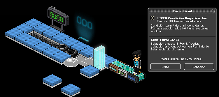 Paso 6: Cogemos la condición wired negativa: el furni no tiene avatares y seleccionamos el roller, la primera casilla banzai y el primer coloreador. Una vez hecho esto, apilamos los 3 wired.