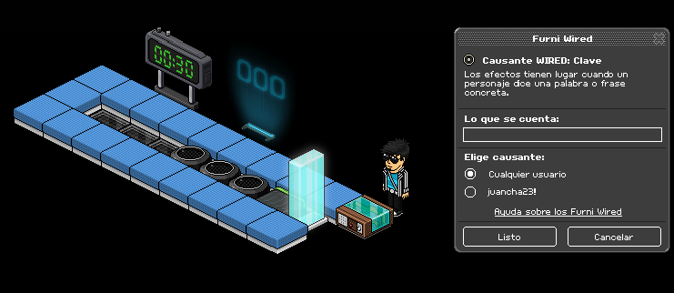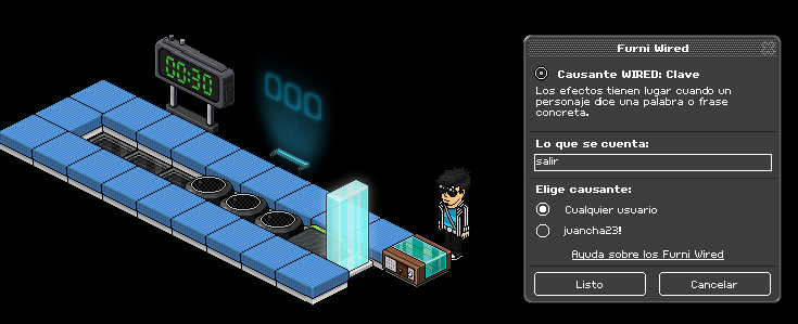 (VOLUNTARIO) Paso 9: Cogemos un causante wired: clave y ponemos una palabra o frase. Una vez hecho esto, lo apilamos sobre un efecto wired: ¡adiós! seleccionando un furni para que nos saque del juego.