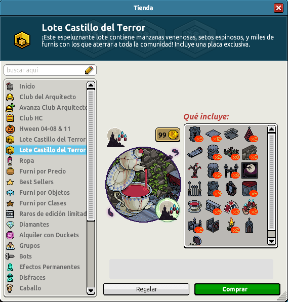 El evento Habbocalypse se va acercando y con ello algunos lotes ya van asomándose por nuestro Hotel. Hoy martes, nos han traído un lote llamado «Lote Castillo del Terror«. Veamos una imagen del mismo: