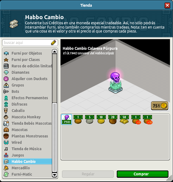 Sí, habbo a puesto ya a la venta la moneda de cambio, La Calavera Púrpura, con un valor de 751$ y que podrá ser canjeada por 750$.