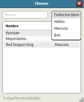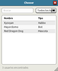 Se ha rediseñado la interfaz del listado de usuarios al decir :chooser. A partir de ahora podrás filtrar por si es usuario, mascota o bot. Además, podrás buscar a los usuarios por nombre.