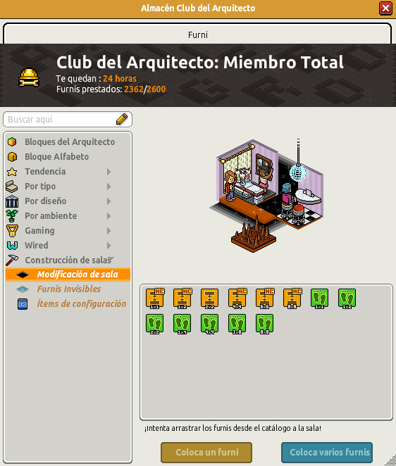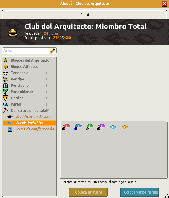 A partir de este momento, los furnis de las secciones ‘Modificación de sala‘ y ‘Furnis Invisibles‘ (dentro de Construcción de salas) del Club del Arquitecto, no contarán para el límite máximo de furnis prestados: baldosas mágicas (apilar y caminar), bloques invisibles y baldosas invisibles.