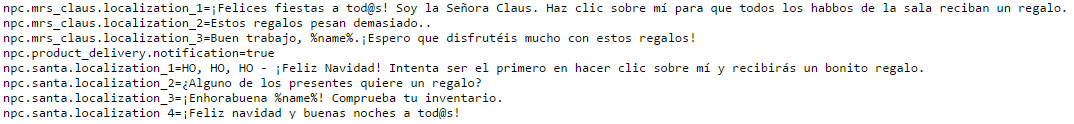Lo que significan estos dos códigos es que se pondrá un bot: la Señora Claus; repartido por el Hotel (desconocemos si por salas privadas o por salas públicas) y al hacer click a este botón, solicitarás un regalo que más tarde te será entregado.