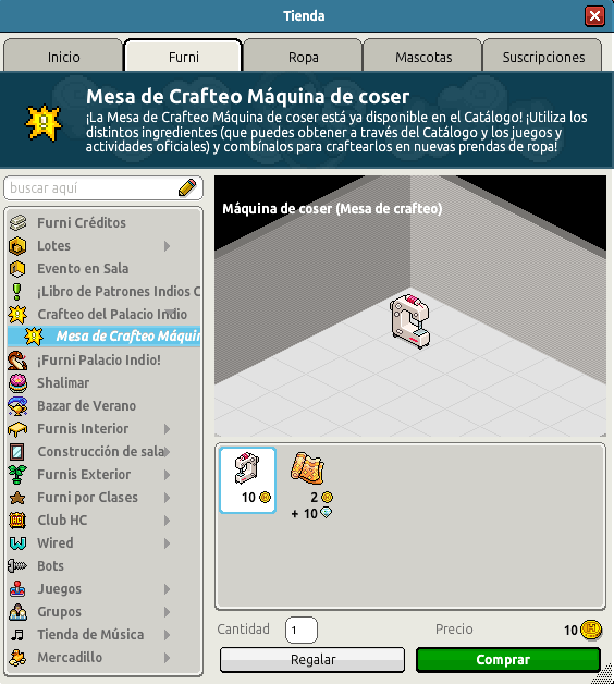 Ya están disponibles los crafteos que te hemos ido anunciando hace semanas. Con estos, podrás conseguir 10 prendas de ropa. Solo tendrás que dirigirte al catálogo, y comprar el furni ‘Máquina de Coser‘ por un precio de 10
