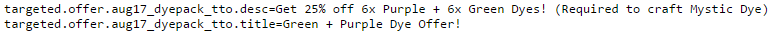 Un par de ofertas relacionadas con dos objetos de ‘crafteo’ de la campaña Bazar, serán lanzadas en agosto. La primera cuenta con un 25% de descuento e incluye: 6 «Purple Dyes» y 6 «Green Dyes». La segunda cuenta con: 1 «Green Dye» y 1 «Purple Dye».