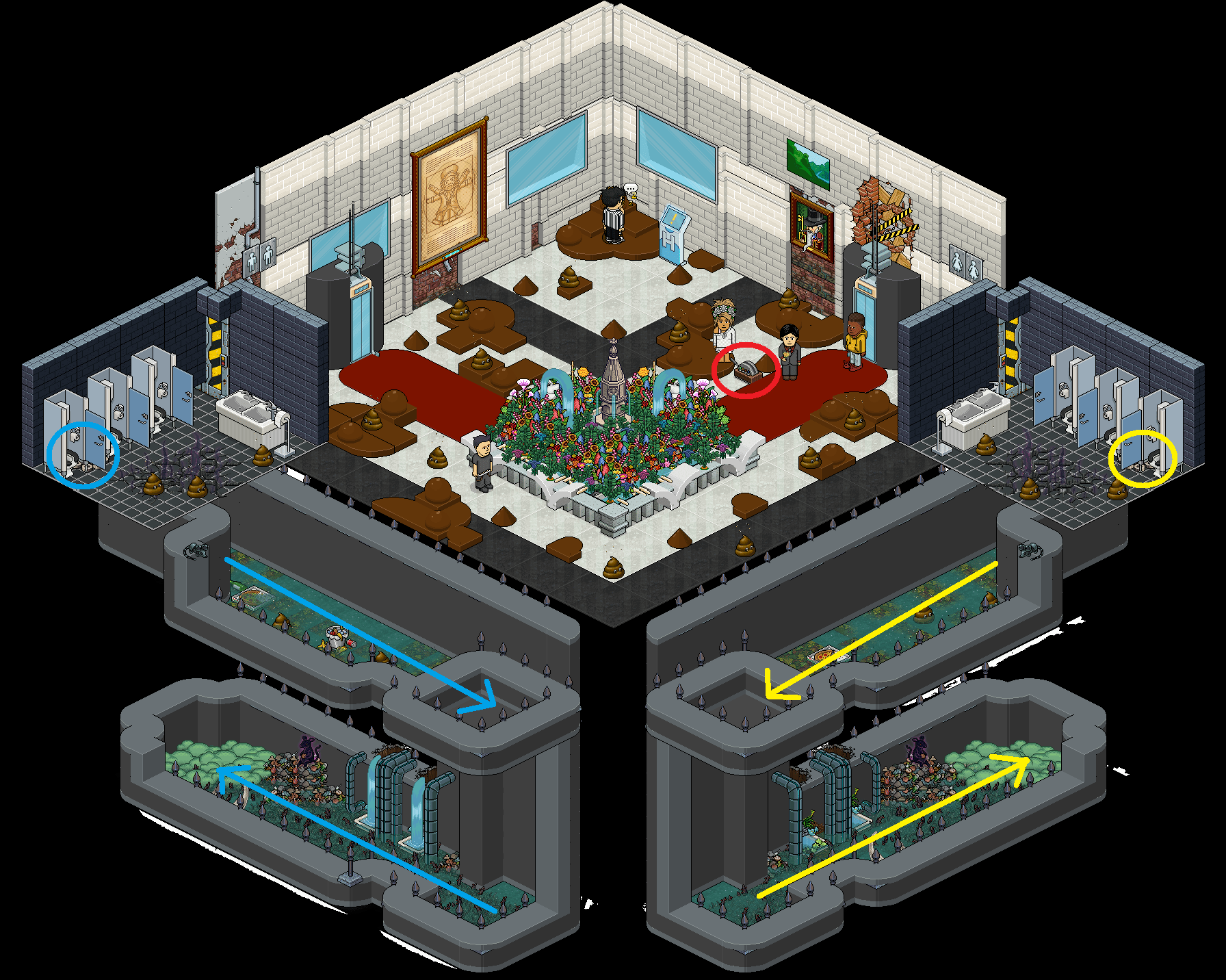 Una vez nos encontremos dentro de la sala tendremos que presionar la palanca que se mueve (siempre portando la placa correspondiente) y nos llevará a unos baños. En donde tendrás que localizar el teleport e ingresar en él. Acto seguido tendrás que pasar por el camino sin que te toquen los furnis que se mueven o de lo contrario tendrás que empezar todo.