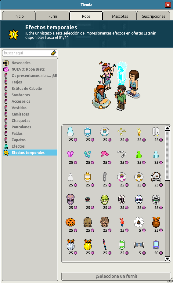 Campaña: El Último de los Píxeles Categoría: Efectos temporales Tipo: Efectos normales Precio: Entre 5 y 3 Fecha de inicio de venta: 06/10/2025 Fecha de final de venta: 03/11/2025 Lugar de venta: Tienda Disponible en BC: No