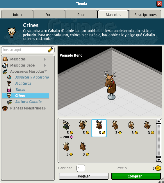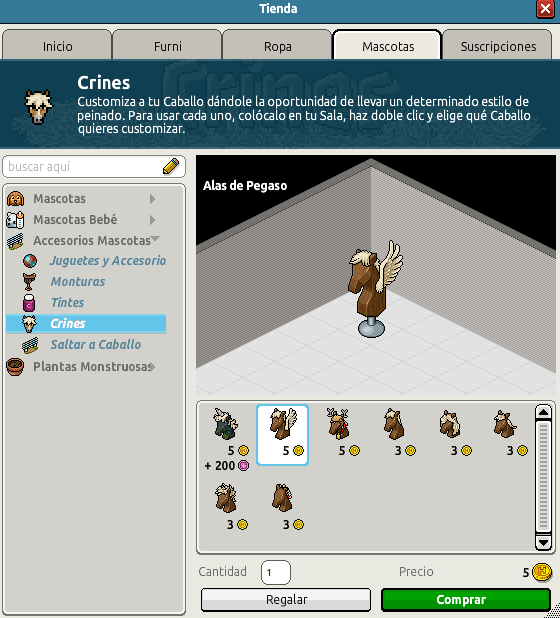 Como te comentábamos, los nuevos accesorios que se ha añadido en la sección Crines del apartado de mascotas son el mítico accesorio Astas de Reno y Alas de Pegaso, ambos por el precio de 5