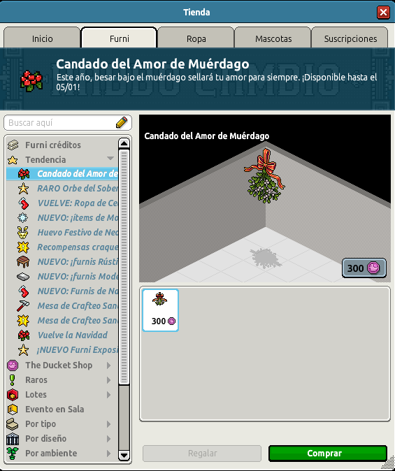 Categoría: Candado del Amor de Muérdago Tipo: Furni normal Precio: 300 (24h), luego 5 + 10 Fecha de inicio de venta: 24/12/2025 Fecha de final de venta: 05/01/2026 Lugar de venta: Tienda Disponible en BC: No