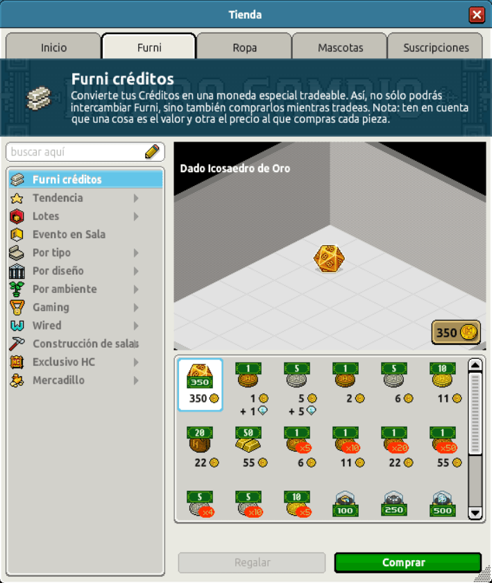 [INT] En venta: Canjeable Dado Icosaedro de Oro Hace 2 años Dantempo 12 Popular Archivada Información de la publicación Publicada: 28/05/2024 13:00:52 H.P.E. Autor: Dantempo Último comentario:@ngelytox Ir Visitas: 600 Información general Categoría: Habbo Créditos Nombre: Dado Icosaedro de Oro Precio: 350 Valor: 350 Fecha de inicio de venta: 28/05/2024 Fecha de final de venta: 31/05/2024 Lugar de venta: Tienda Imagen del ítem y catálogo