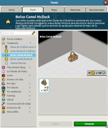 Nombre: Bolso Camel McDuck Precio: 9 + 10 Fecha de inicio de venta: 30/04/2025 Fecha de final de venta: 01/05/2025 Lugar de venta: Tienda Efecto necesario: No Número de clics: 1