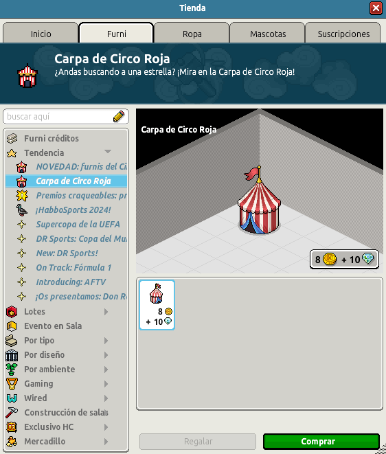 [INT] En venta: Crackable Carpa de Circo Roja Hace 2 años Luuuuucia! 14 Popular Archivada Información de la publicación Publicada: 27/08/2024 12:00:52 H.P.E. Autor: Luuuuucia! Último comentario:@ngelytox Ir Visitas: 1105 Información general Nombre: Carpa de Circo Roja Precio: 8 + 10 Fecha de inicio de venta: 27/08/2024 Fecha de final de venta: 28/08/2024 Lugar de venta: Tienda Efecto necesario: No Número de clics: 1 Imagen del ítem y catálogo Probabilidad