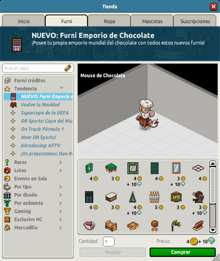 [INT] En venta: Furnis Emporio de Chocolate Hace 2 años Paxla 8 Popular Archivada Información de la publicación Publicada: 04/12/2023 13:03:28 H.P.E. Autor: Paxla Último comentario:javier2 Ir Visitas: 384 Información general Categoría: Navidad Tipo: Furnis Precio: Entre 3 y 6 + 10 Fecha de inicio de venta: 01/12/2023 Fecha de final de venta: 31/12/2023 Lugar de venta: Tienda Disponible en BC: Sí Imagen del catálogo