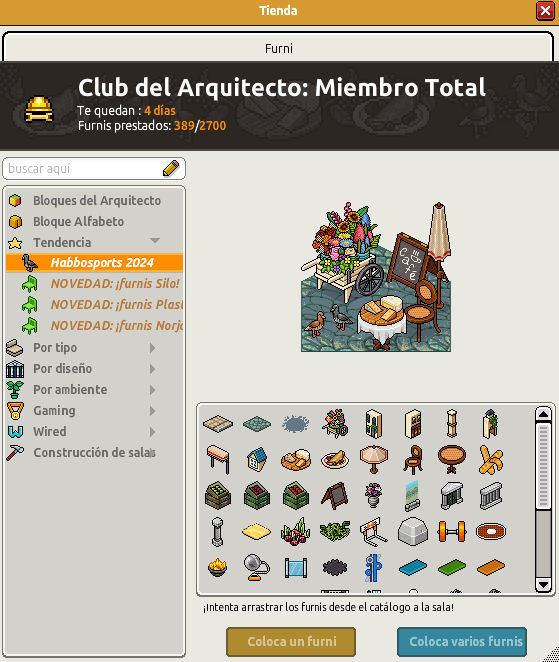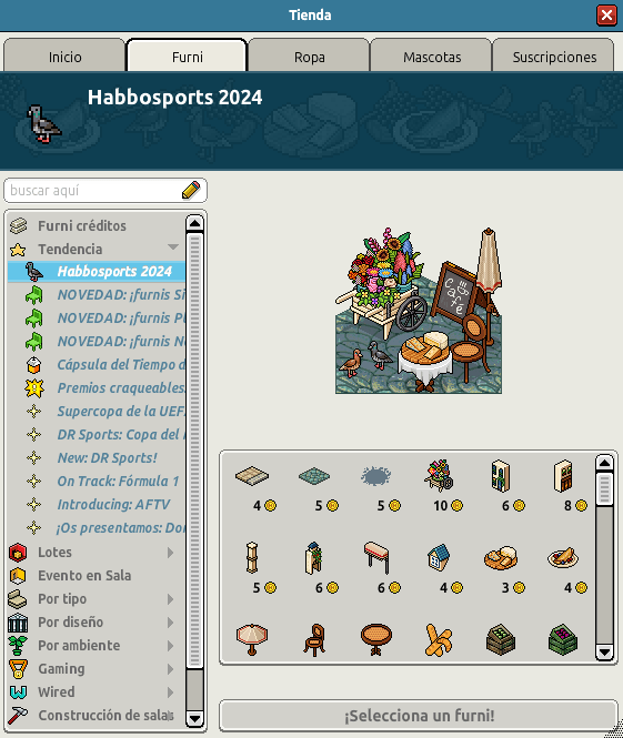 [INT] En venta: Furnis HabboSports 2024 Hace 2 años Dantempo 9 Popular Archivada Información de la publicación Publicada: 17/07/2024 12:26:45 H.P.E. Autor: Dantempo Último comentario:@ngelytox Ir Visitas: 615 Información general Categoría: Habbo Historia Tipo: Furni normal Precio: Entre 3 y 20 Fecha de inicio de venta: 17/07/2024 Fecha de final de venta: 31/07/2024 Lugar de venta: Tienda Disponible en BC: Sí Imagen del catálogo
