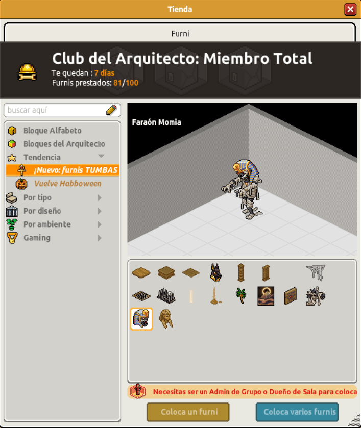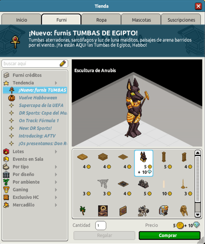 [INT] En venta: Furnis Tumbas de Egipto Hace 3 años Dantempo 5 Popular Archivada Información de la publicación Publicada: 02/10/2023 14:11:44 H.P.E. Autor: Dantempo Último comentario:aniita16L Ir Visitas: 679 Información general Categoría: HabboWeen Tipo: Furnis Precio: Entre 3 y 10 + 10 Fecha de inicio de venta: 01/10/2023 Fecha de final de venta: 31/10/2023 Lugar de venta: Tienda Disponible en BC: Sí Imagen del catálogo