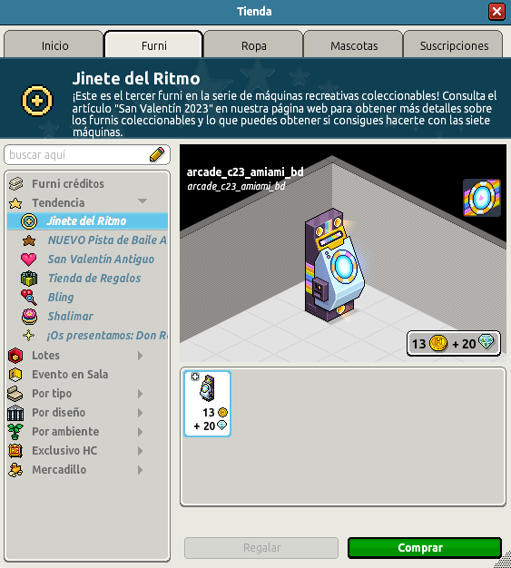 [INT] En venta: Jinete del Ritmo Hace 3 años Necromax. 4 Popular Archivada Información de la publicación Publicada: 09/02/2023 12:59:33 H.P.E. Autor: Necromax. Último comentario:@ngelytox Ir Visitas: 876 Información general Nombre: Jinete del Ritmo Precio: 13 + 20 Fecha de inicio de venta: 09/02/23 Fecha de final de venta: 11/02/23 Lugar de venta: Tienda Categoría: Furni Imagen del ítem y catálogo Placa Jinete del Ritmo ¡Verifica esta placa! Ítem extra Por la compra de los 7 ítems coleccionables desde el catálogo, recibirás de manera automática: Atrapa ese pato Placa aún no alojada ¡Verifica esta placa!