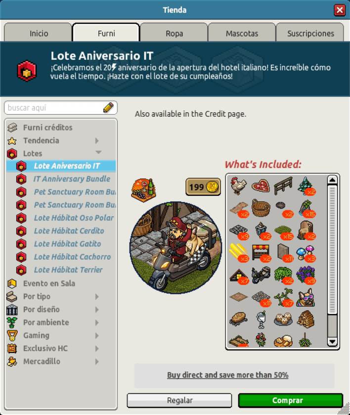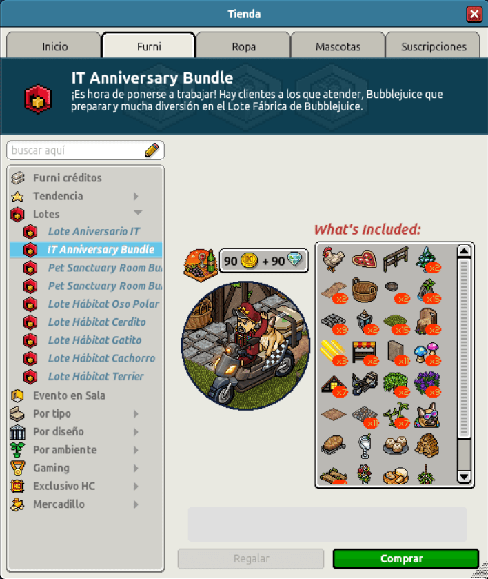 Nombre: Lote Aniversario IT Precio: 90 + 90 | 199 Fecha de inicio de venta: 21/11/2023 Fecha de final de venta: 28/11/2023 Lugar de venta: Tienda + Habbo compras