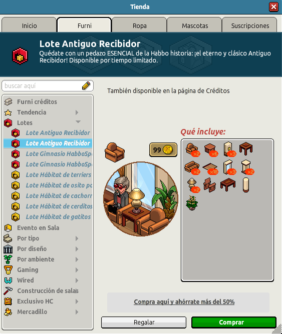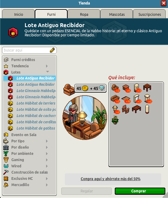 Nombre: Lote Antiguo Recibidor Precio: 45 + 45 | 99 Fecha de inicio de venta: 29/07/2024 Fecha de final de venta: 05/08/2024 Lugar de venta: Tienda + Habbo compras