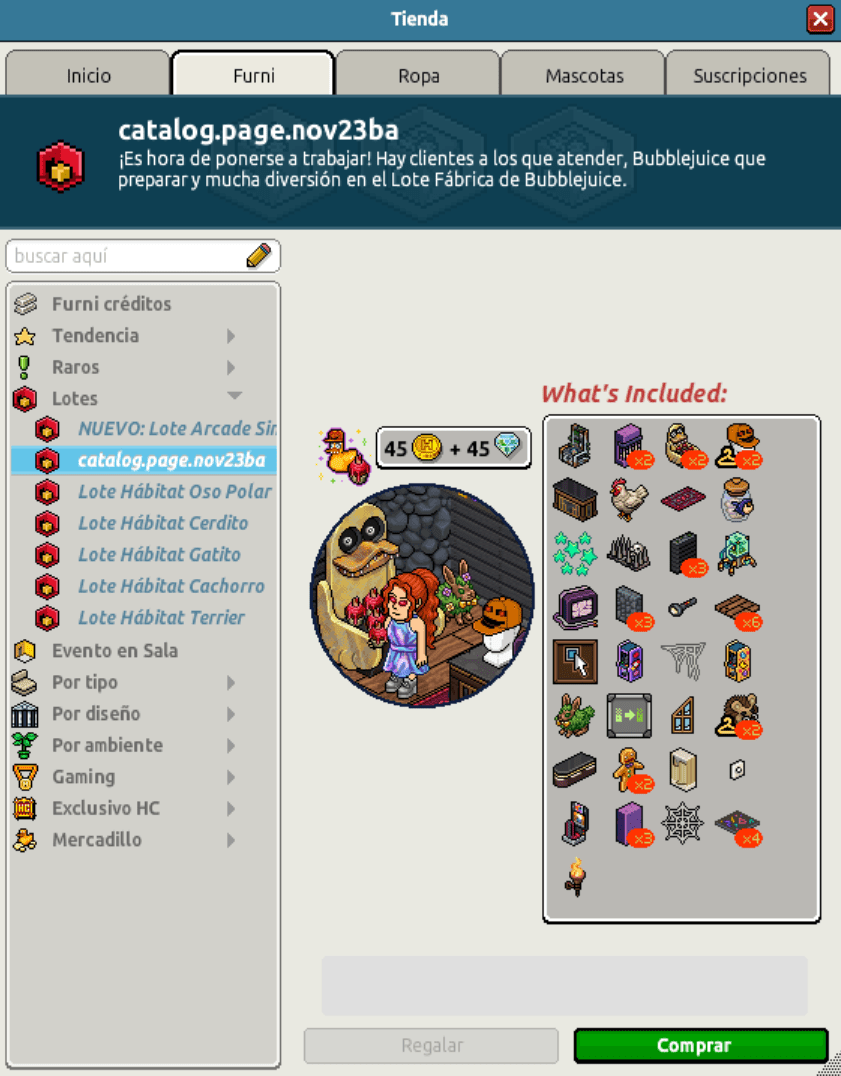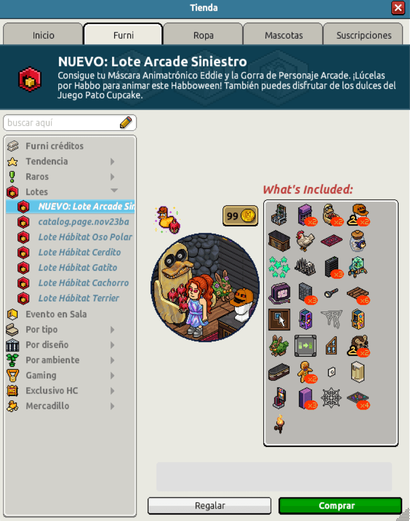 Nombre: Lote Arcade Siniestro Precio: 45 + 45 | 99 Fecha de inicio de venta: 02/11/2023 Fecha de final de venta: 09/11/2023 Lugar de venta: Tienda + Habbo Compras