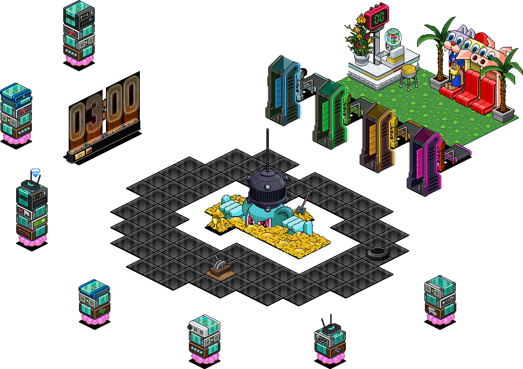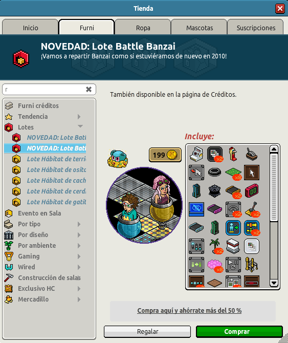 Me gusta mucho la sala, el lote trae cosas muy interesantes como Wireds y Puertas Transpixelares. Parece divertido jugar Battle Banzai en este diseño. La placa también me gusta!! Creo que el precio de lote típico de 99 créditos sería bastante generoso, pero considero que 199 es excesivo. Tal vez un precio intermedio hubiera sido ideal.