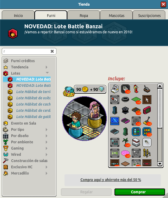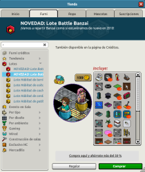 Nombre: Lote Battle Banzai Precio: 90 + 90 | 199 Fecha de inicio de venta: 22/07/2024 Fecha de final de venta: 29/07/2024 Lugar de venta: Tienda + Habbo compras