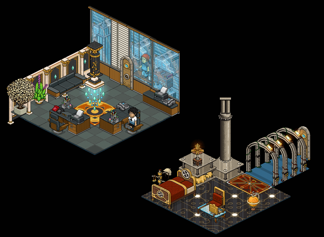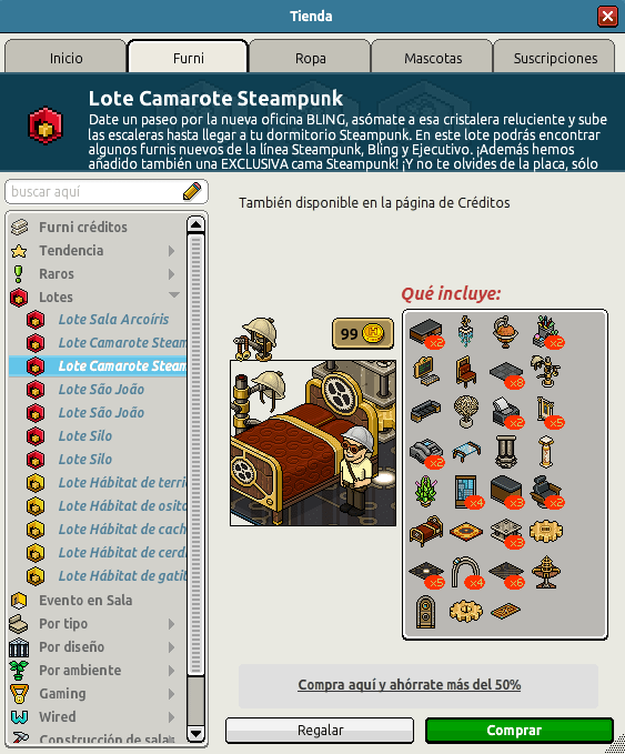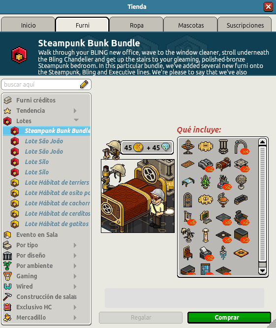 Tengo este lote por haberlo adquirido hace muchos años, así que no volveré a comprarlo esta vez. La sala es linda, pero la combinación de temáticas no es la mejor. Igualmente, los furnis que trae son útiles y me gusta la placa nueva y la cama Steampunk exclusiva.