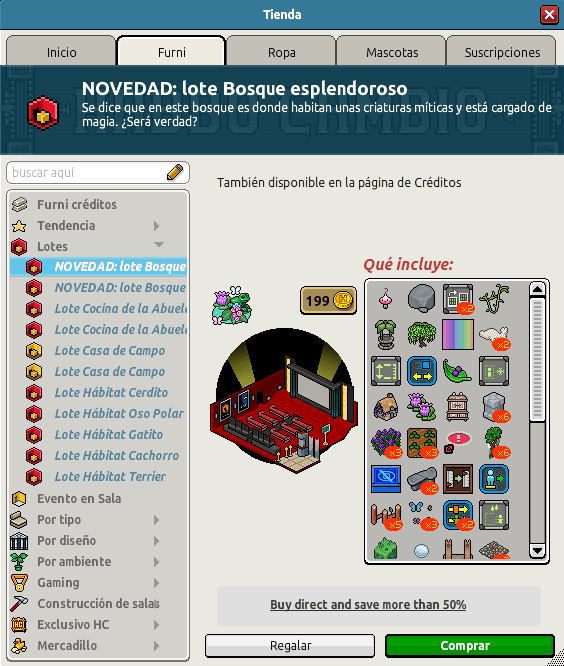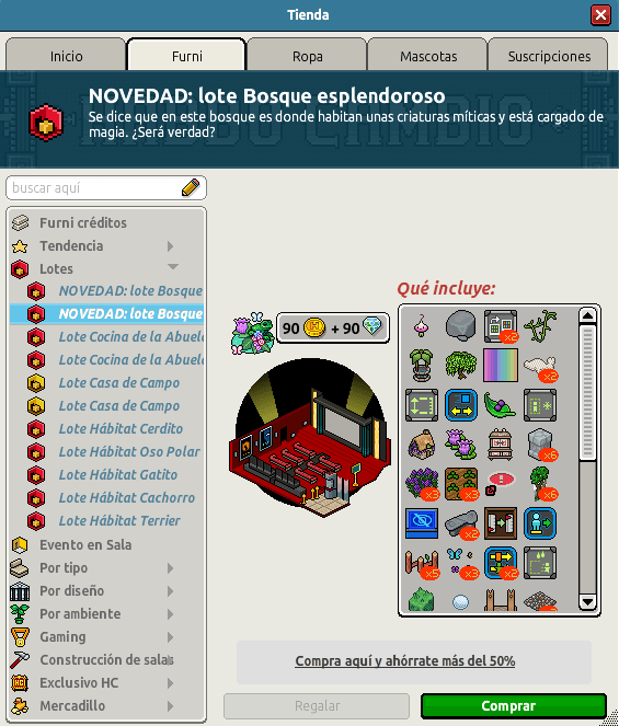 Nombre: Lote Bosque Esplendoroso Precio: 90 + 90 | 199 Fecha de inicio de venta: 18/03/2024 Fecha de final de venta: 25/03/2024 Lugar de venta: Tienda + Habbo Compras