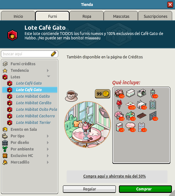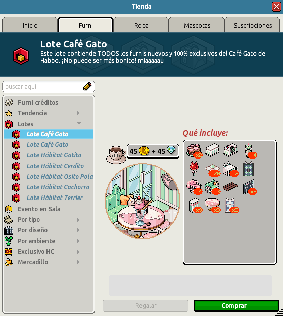 [INT] En venta: Lote Café Gato Hace 3 años Dantempo 5 Popular Archivada Información de la publicación Publicada: 03/05/2023 13:05:21 H.P.E. Autor: Dantempo Último comentario:@ngelytox Ir Visitas: 1305 Información general Nombre: Lote Café Gato Precio: 45 + 45 | 99 Fecha de inicio de venta: 03/05/2023 Fecha de final de venta: 10/05/2023 Lugar de venta: Tienda + Habbo compras Imagen del catálogo Placa Lote Café Gato ¡Verifica esta placa!