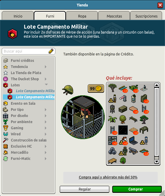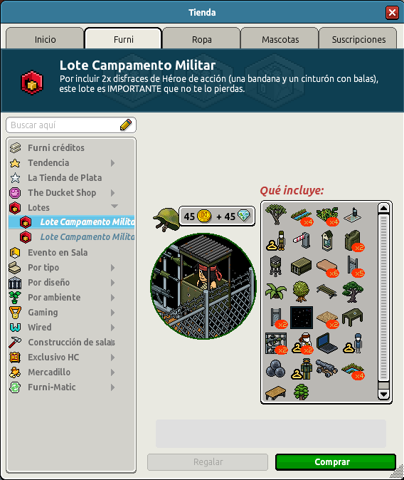 [INT] En venta: Lote Campamento Militar Hace 2 semanas Kyovyan 7 Popular Información de la publicación Se archivará automáticamente en 2 meses. Publicada: 15/10/2025 13:01:37 H.P.E. Autor: Kyovyan Último comentario:@ngelytox Ir Visitas: 208 Información general Nombre: Lote Campamento Militar Precio: 45 + 45 | 99 Fecha de inicio de venta: 15/10/2025 Fecha de final de venta: 22/10/2025 Lugar de venta: Tienda + Habbo Compras Imágenes del catálogo Placa Lote Campamento Militar ¡Verifica esta placa!