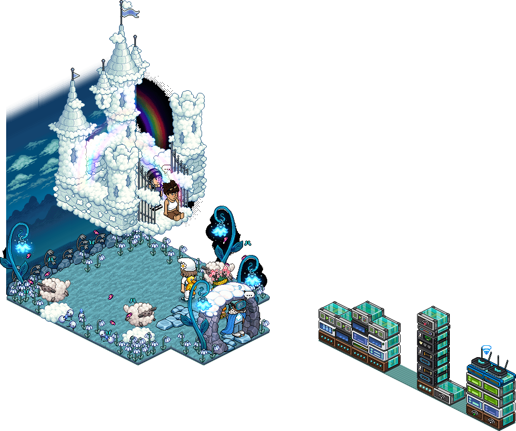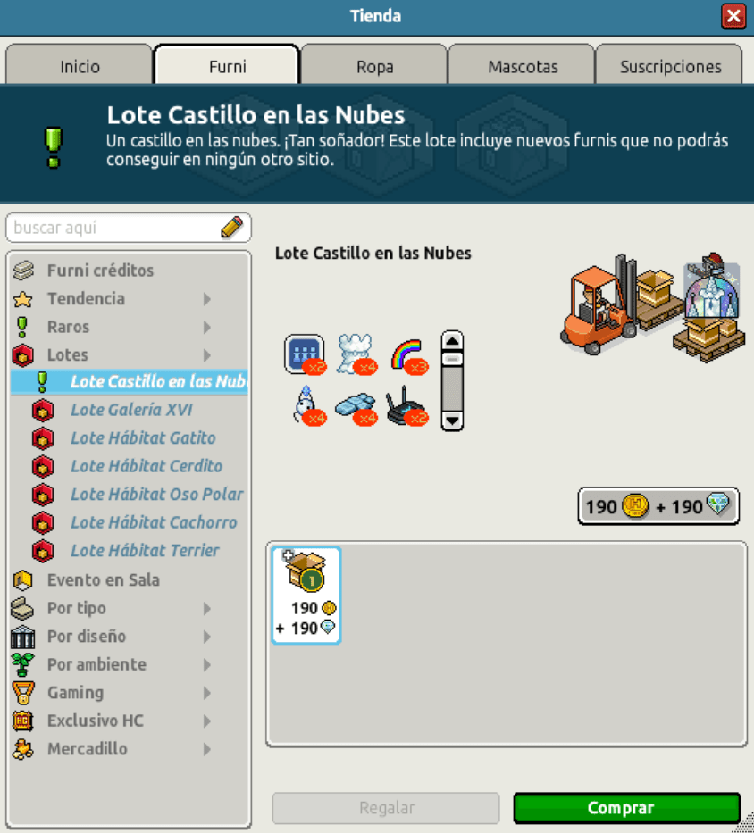 Nombre: Lote Castillo en las Nubes Precio: 190 + 190 Fecha de inicio de venta: 03/07/2023 Fecha de final de venta: 10/07/2023 Lugar de venta: Tienda + Habbo Compras