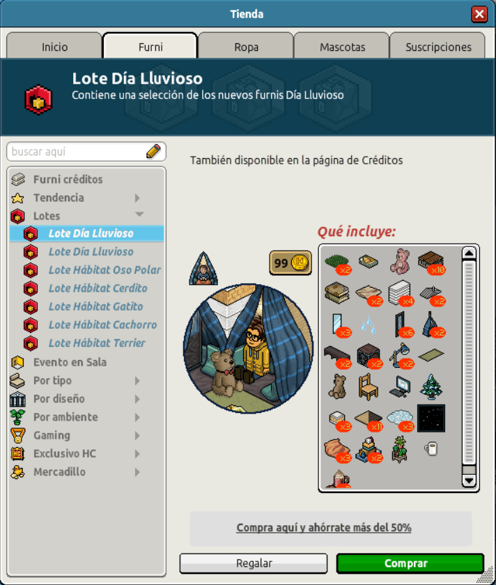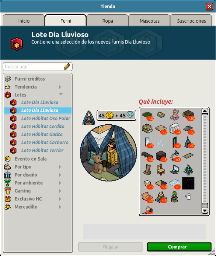 [INT] En venta: Lote Día Lluvioso Hace 3 años Kyovyan 6 Popular Archivada Información de la publicación Publicada: 19/09/2023 12:42:28 H.P.E. Autor: Kyovyan Último comentario:@ngelytox Ir Visitas: 820 Información general Nombre: Lote Día Lluvioso Precio: 45 + 45 | 99 Fecha de inicio de venta: 19/09/23 Fecha de final de venta: 26/09/23 Lugar de venta: Tienda + Habbo Compras Imagen del catálogo Placa Lote Día Lluvioso ¡Verifica esta placa!