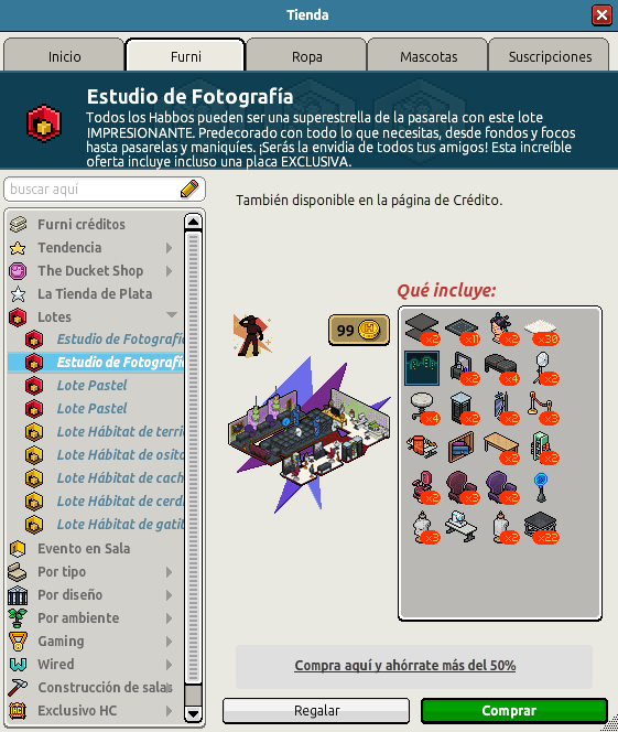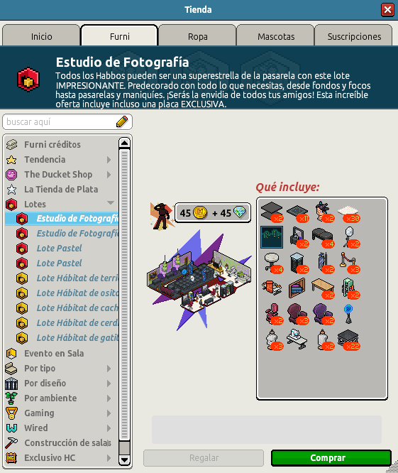 [INT] En venta: Lote Estudio de Fotografía Hace 1 año Kyovyan 10 Popular Archivada Información de la publicación Publicada: 01/04/2025 13:07:39 H.P.E. Autor: Kyovyan Último comentario:@ngelytox Ir Visitas: 462 Información general Nombre: Lote Estudio de Fotografía Precio: 45 + 45 | 99 Fecha de inicio de venta: 01/04/2025 Fecha de final de venta: 08/04/2025 Lugar de venta: Tienda + Habbo Compras Imágenes del catálogo Placa Lote Estudio Fotográfico ¡Verifica esta placa!