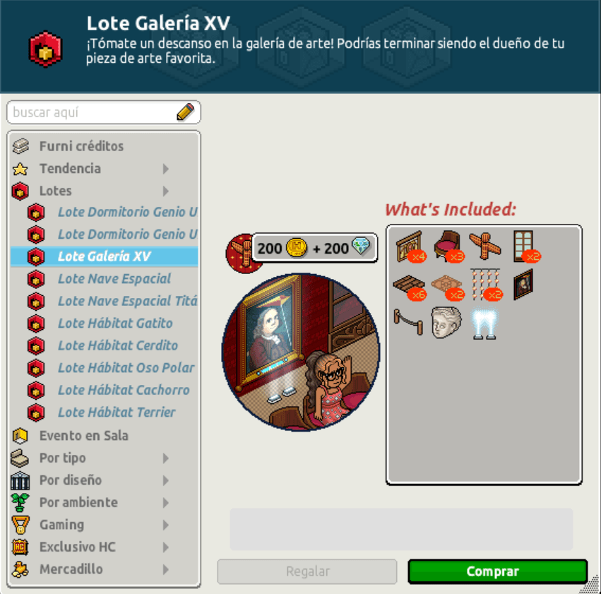 [INT] En venta: Lote Galería XV Hace 3 años Dantempo 7 Popular Archivada Información de la publicación Publicada: 14/06/2023 13:12:06 H.P.E. Autor: Dantempo Último comentario:@ngelytox Ir Visitas: 350 Información general Nombre: Galería XV Precio: 200 + 200 Fecha de inicio de venta: 14/06/2023 Fecha de final de venta: 21/06/2023 Lugar de venta: Tienda + Habbo compras Imagen del catálogo Placa Lote Galería XV ¡Verifica esta placa!