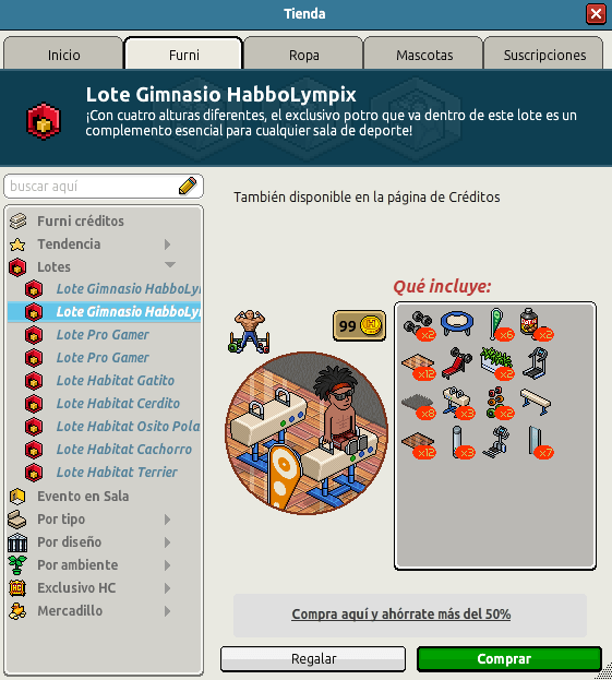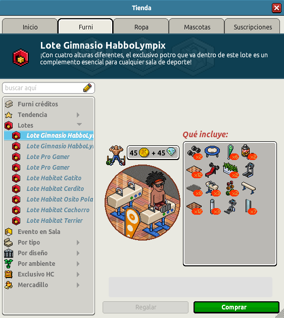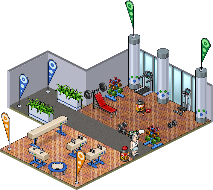Como se mencionó antes, ha llegado al hotel el Lote Gimnasio HabboLímpico el cuál cuenta con 64 furnis con temática de gimnasio para que puedas ejercitar tus píxeles. El mismo cuenta con un precio de 99