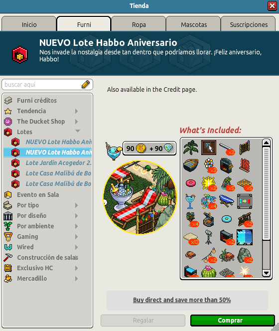 Nombre: Lote Habbo Aniversario Precio: 99 + 99 | 199 Fecha de inicio de venta: 04/08/2025 Fecha de final de venta: 11/08/2025 Lugar de venta: Tienda + Habbo compras