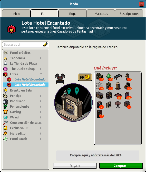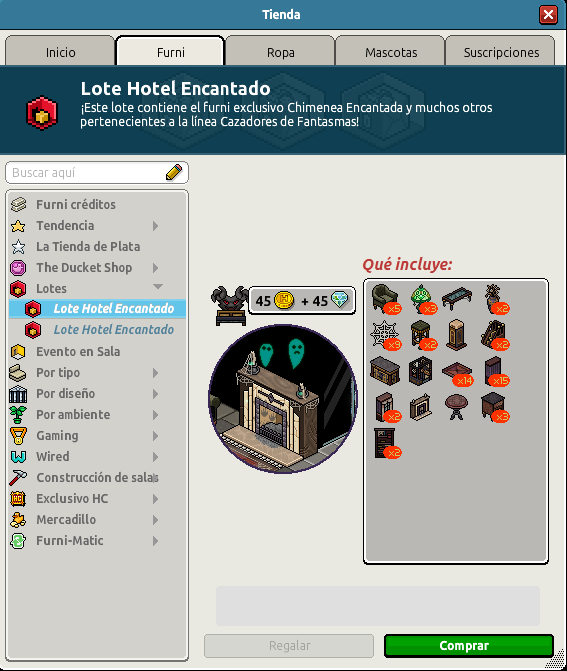 Nombre: Lote Hotel Encantado Precio: 45 + 45 | 99 Fecha de inicio de venta: 22/10/2025 Fecha de final de venta: 29/10/2025 Lugar de venta: Tienda + Habbo Compras