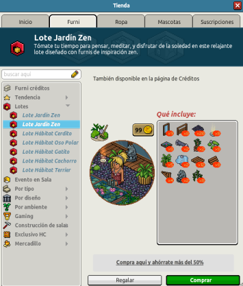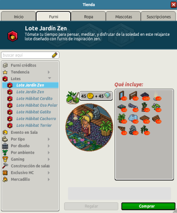Nombre: Lote Jardín Zen Precio: 45 + 45 | 99 Fecha de inicio de venta: 22/01/2024 Fecha de final de venta: 29/01/2024 Lugar de venta: Tienda + Habbo compras
