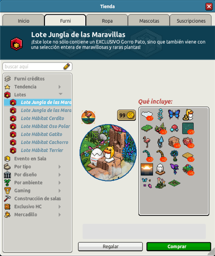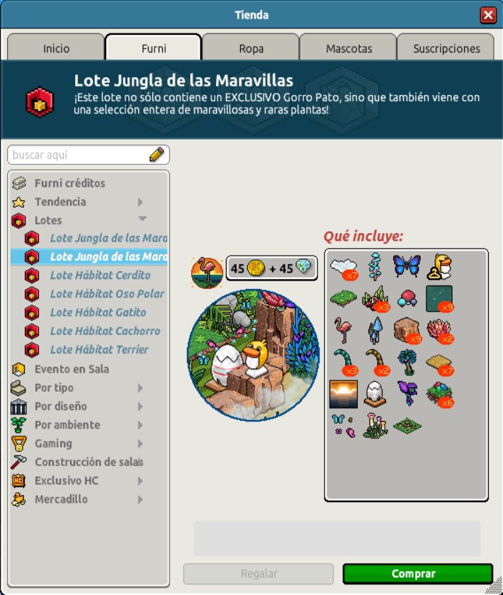 [INT] En venta: Lote Jungla de las Maravillas Hace 2 años Luuuuucia! 10 Popular Archivada Información de la publicación Publicada: 15/04/2024 13:01:52 H.P.E. Autor: Luuuuucia! Último comentario:@ngelytox Ir Visitas: 279 Información general Nombre: Lote Jungla de las Maravillas Precio: 45 + 45 | 99 Fecha de inicio de venta: 15/04/2024 Fecha de final de venta: 22/04/2024 Lugar de venta: Tienda + Habbo compras Imagen del catálogo Placa Lote Jungla de las Maravillas ¡Verifica esta placa!