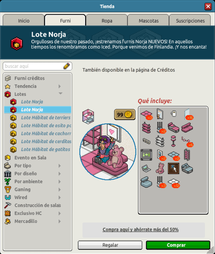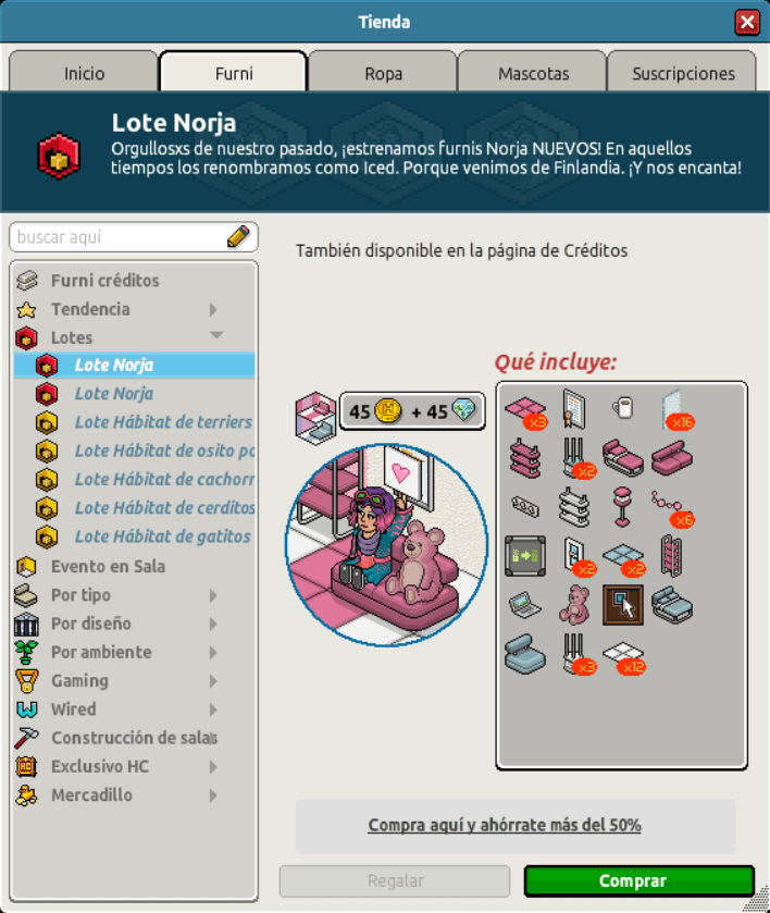Nombre: Lote Norja Precio: 45 + 45 | 99 Fecha de inicio de venta: 03/06/2024 Fecha de final de venta: 10/06/2024 Lugar de venta: Tienda + Habbo Compras