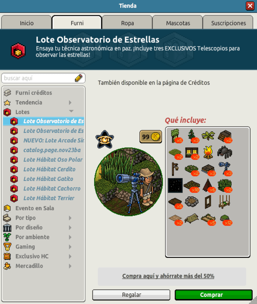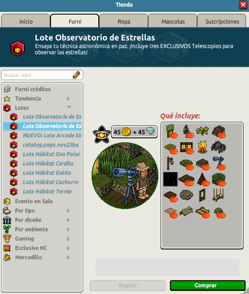 Nombre: Lote Observatorio de Estrellas Precio: 45 + 45 | 99 Fecha de inicio de venta: 07/11/2023 Fecha de final de venta: 14/11/2023 Lugar de venta: Tienda + Habbo compras