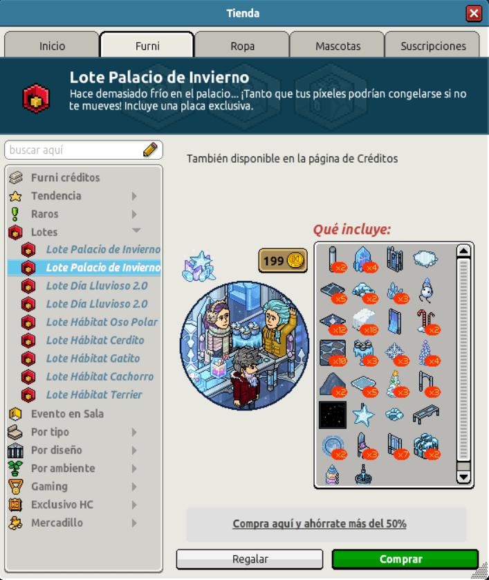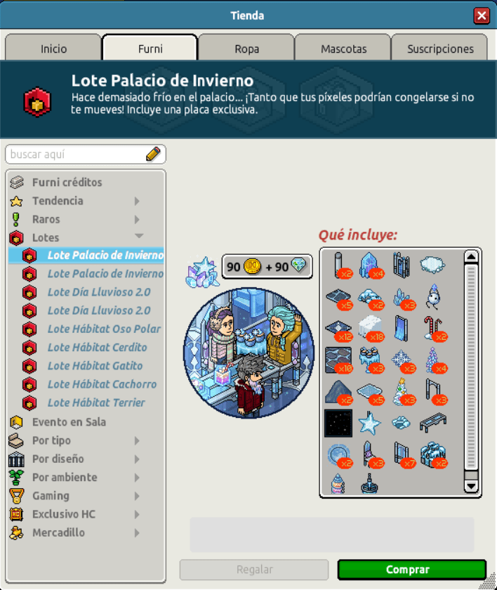 [INT] En venta: Lote Palacio de Invierno Hace 2 años mateo54759 10 Popular Archivada Información de la publicación Publicada: 28/11/2023 13:08:48 H.P.E. Autor: mateo54759 Último comentario:@ngelytox Ir Visitas: 488 Información general Nombre: Lote Palacio de Invierno Precio: 90 + 90 | 199 Fecha de inicio de venta: 28/11/23 Fecha de final de venta: 05/12/23 Lugar de venta: Tienda + Habbo compras Imagen del catálogo Placa Lote Palacio de Invierno ¡Verifica esta placa!