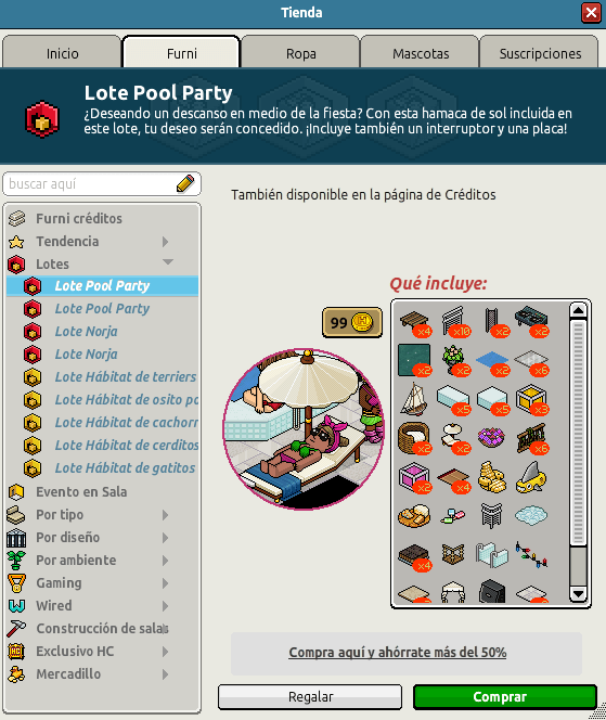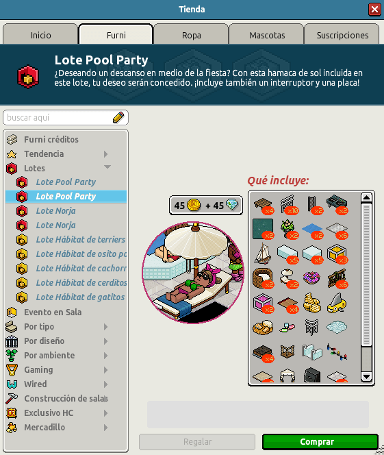 Nombre: Lote Pool Party Precio: 45 + 45 | 99 Fecha de inicio de venta: 05/06/2024 Fecha de final de venta: 12/06/2024 Lugar de venta: Tienda + Habbo Compras