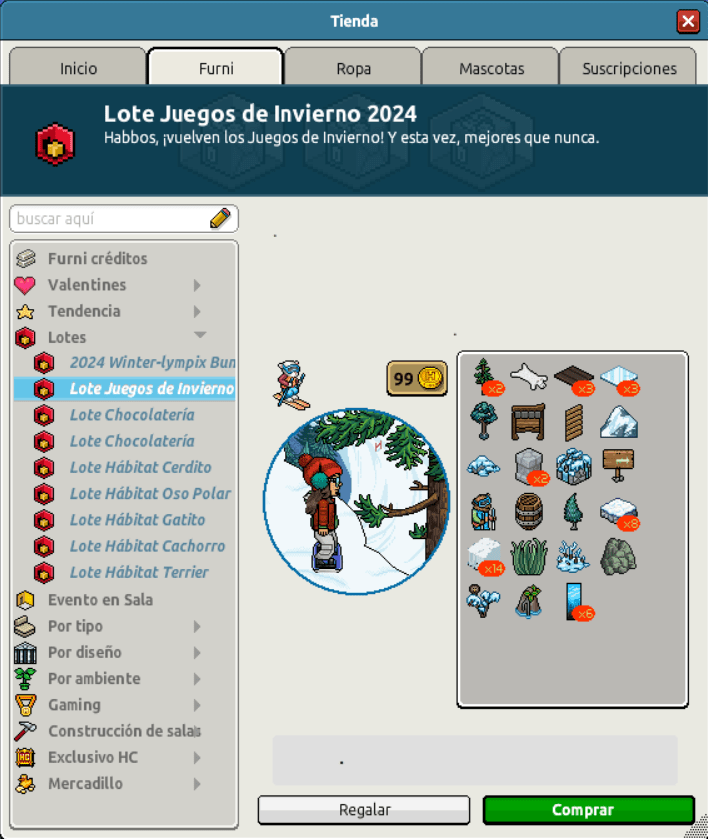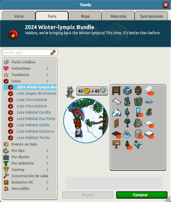 [INT] En venta: Lote Renovado Juegos de Invierno 2024 Hace 2 años Kyovyan 7 Popular Archivada Información de la publicación Publicada: 19/02/2024 13:03:42 H.P.E. Autor: Kyovyan Último comentario:@ngelytox Ir Visitas: 654 Información general Nombre: Lote Juegos de Invierno 2024 Precio: 45 + 45 | 99 Fecha de inicio de venta: 19/02/2024 Fecha de final de venta: 26/02/2024 Lugar de venta: Tienda + Habbo Compras Imágenes de catálogo Placa Lote Juegos de Invierno 2024 ¡Verifica esta placa!