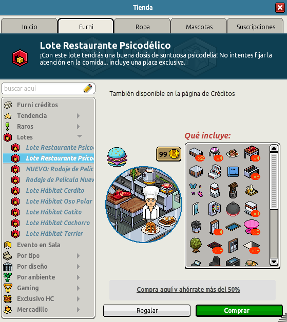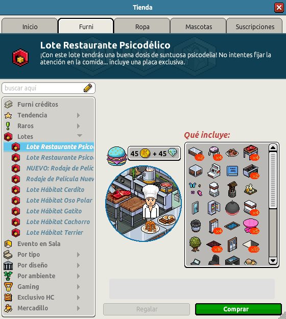 Nombre: Lote Restaurante Psicodélico Precio: 45 + 45 | 99 Fecha de inicio de venta: 10/08/23 Fecha de final de venta: 17/08/23 Lugar de venta: Tienda + Habbo compras
