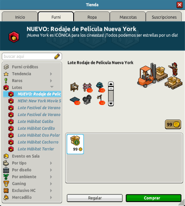 [INT] En venta: Lote Rodaje de Película en Nueva York Hace 3 años Kyovyan 6 Popular Archivada Información de la publicación Publicada: 08/08/2023 12:47:03 H.P.E. Autor: Kyovyan Último comentario:@ngelytox Ir Visitas: 334 Información general Nombre: Lote Rodaje de Película en Nueva York Precio: 45 + 45 | 99 Fecha de inicio de venta: 08/08/23 Fecha de final de venta: 15/08/23 Lugar de venta: Tienda + Habbo Compras Imagen del catálogo Placa Rodaje de Película en Nueva York ¡Verifica esta placa!