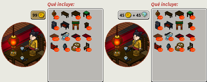 Este sería el Lote Salón del Té, un conjunto de furnis que han sido desempolvados y sacados del desván para reaparecer por nuestro mundo virtual y traernos un aire oriental a nuestras vidas. ¿Quién no va a querer tomarse una taza de té en un espacio con tanta decoración zen que nos inunda de paz? Estará durante un tiempo limitado en tienda por un valor de 45