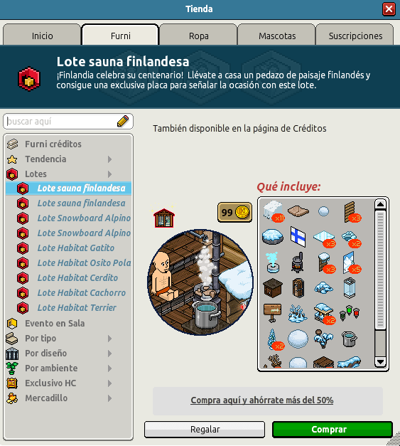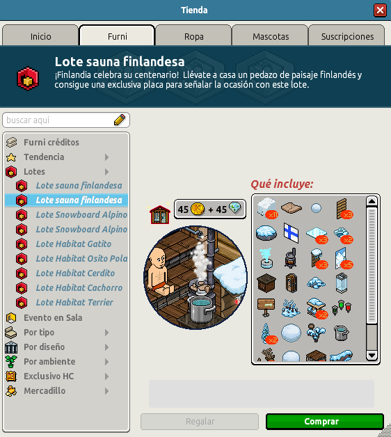 Se trata del Lote Sauna Finlandesa, el cual está basado en el país de Finlandia, donde podremos encontrar las mejores saunas donde refugiarnos un poco del frío que hace fuera, donde todo se encuentra cubierto de nieve a muy bajas temperaturas. Este, podremos adquirirlo por el módico precio de 45