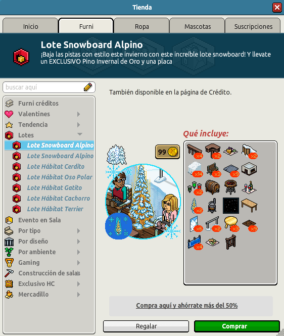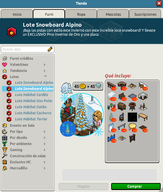 Nombre: Lote Snowboard Alpino Precio: 45 + 45 | 99 Fecha de inicio de venta: 26/02/2024 Fecha de final de venta: 04/03/2024 Lugar de venta: Tienda + Habbo compras