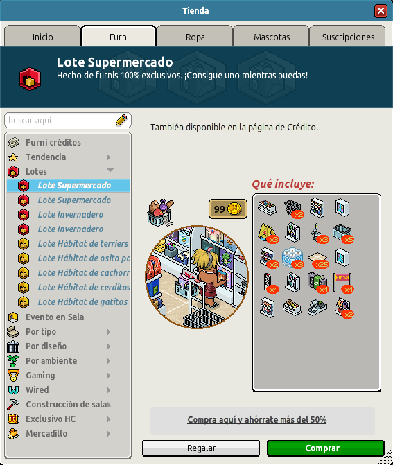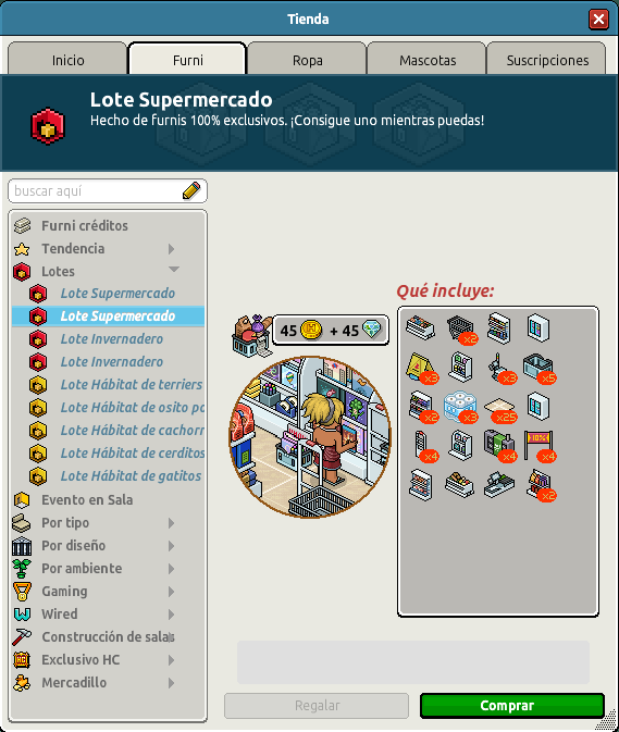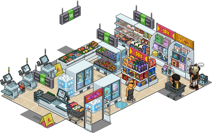 Nombre: Lote Supermercado Precio: 45 + 45 | 99 Fecha de inicio de venta: 07/01/2025 Fecha de final de venta: 14/01/2025 Lugar de venta: Tienda + Habbo compras