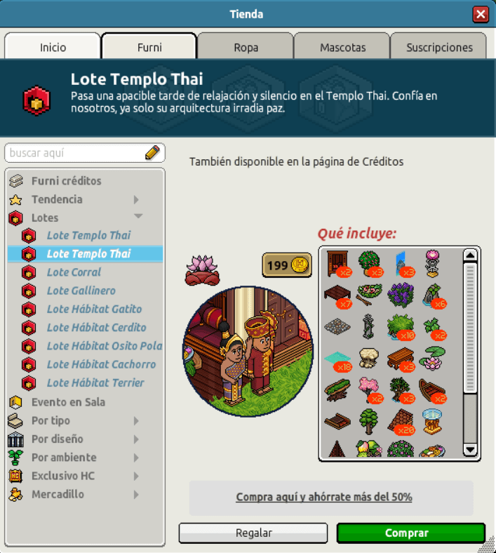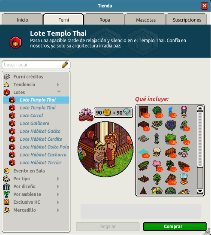 [INT] En venta: Lote Templo Thai Hace 3 años Kyovyan 6 Popular Archivada Información de la publicación Publicada: 19/04/2023 13:01:19 H.P.E. Autor: Kyovyan Último comentario:@ngelytox Ir Visitas: 407 Información general Nombre: Lote Templo Thai Precio: 90 + 90 | 199 Fecha de inicio de venta: 19/04/23 Fecha de final de venta: 26/04/23 Lugar de venta: Tienda + Habbo compras Imagen del catálogo Placa Lote Templo Thai ¡Verifica esta placa!